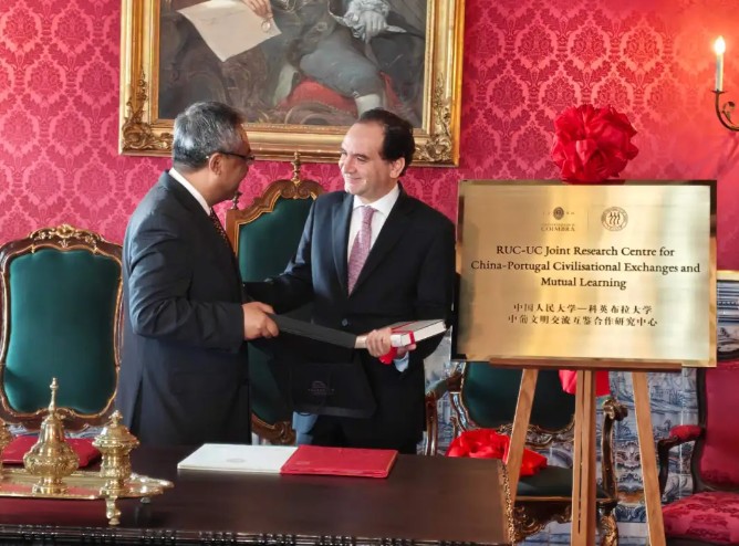 O reitor da Universidade Renmin, o vice-reitor da Universidade de Coimbra e representantes de ambas as instituições estiveram igualmente presentes.
