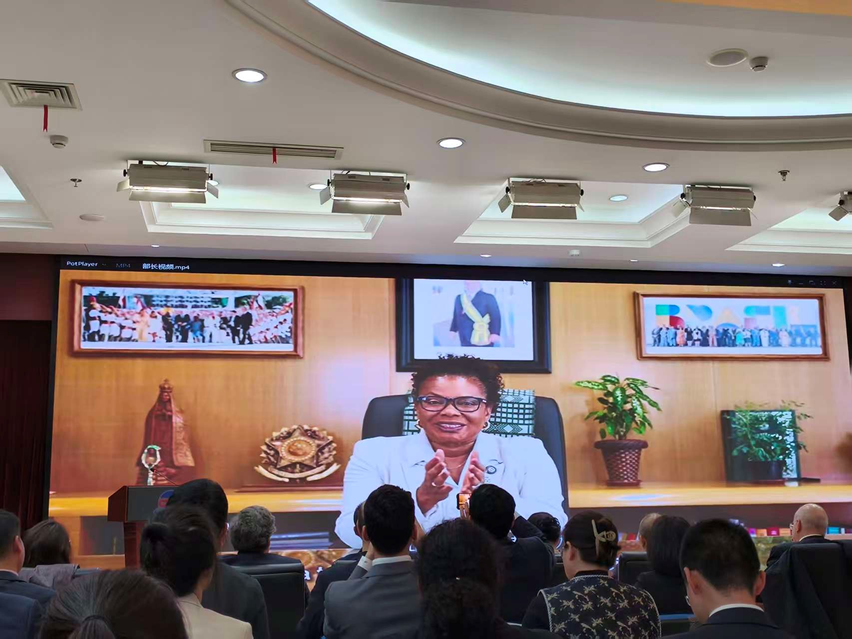 A ministra da Cultura do Brasil, Margareth Menezes, proferiu um discurso por vídeo no evento. (Foto: Lu Yang/Diário do Povo Online)
