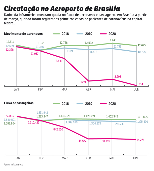 Os primeiros registros de brasileiros infectados pelo novo coronavírus foram daqueles recém-chegados de viagens internacionais. Aeroportos e companhias aéreas foram os primeiros a adotar medidas de segurança e protocolos de higienização, como forma de prevenção da doença. Com o agravamento da pandemia no país, uma das consequências mostrou-se na redução drástica do número de voos. Segundo levantamento da Confederação Nacional dos Transportes (CNT), a queda no transporte de passageiros no setor aéreo, em abril, chegou a 95%. O presidente da entidade, Vander Francisco Costa, explica que, passados quatro meses, percebe-se os primeiros sinais de recuperação. Em Brasília, o aeroporto, que chegou a ter queda no movimento de passageiros de mais de 50%, prevê aumento gradativo no fluxo de pessoas.